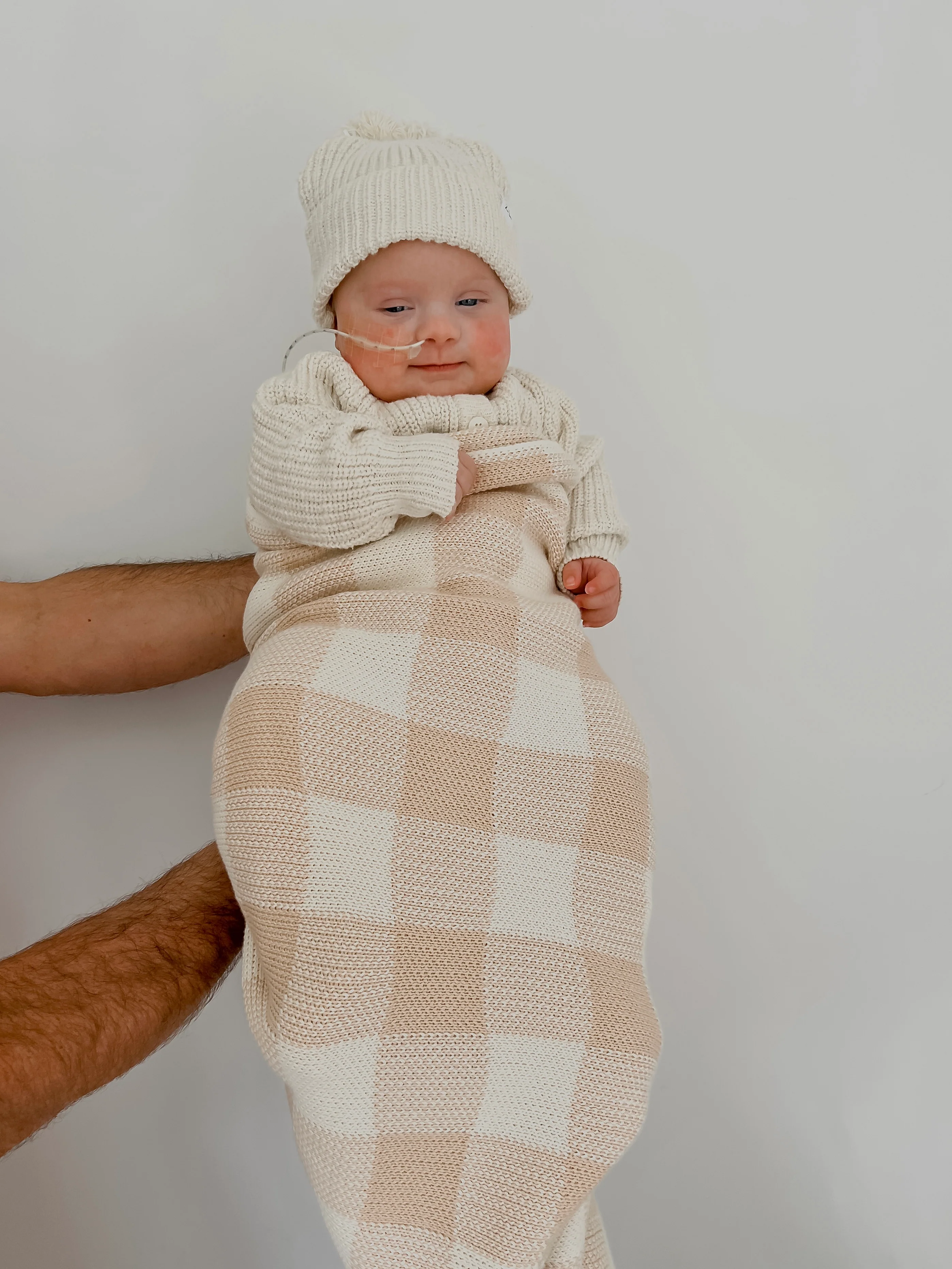 Caramel gingham knitted blanket.
