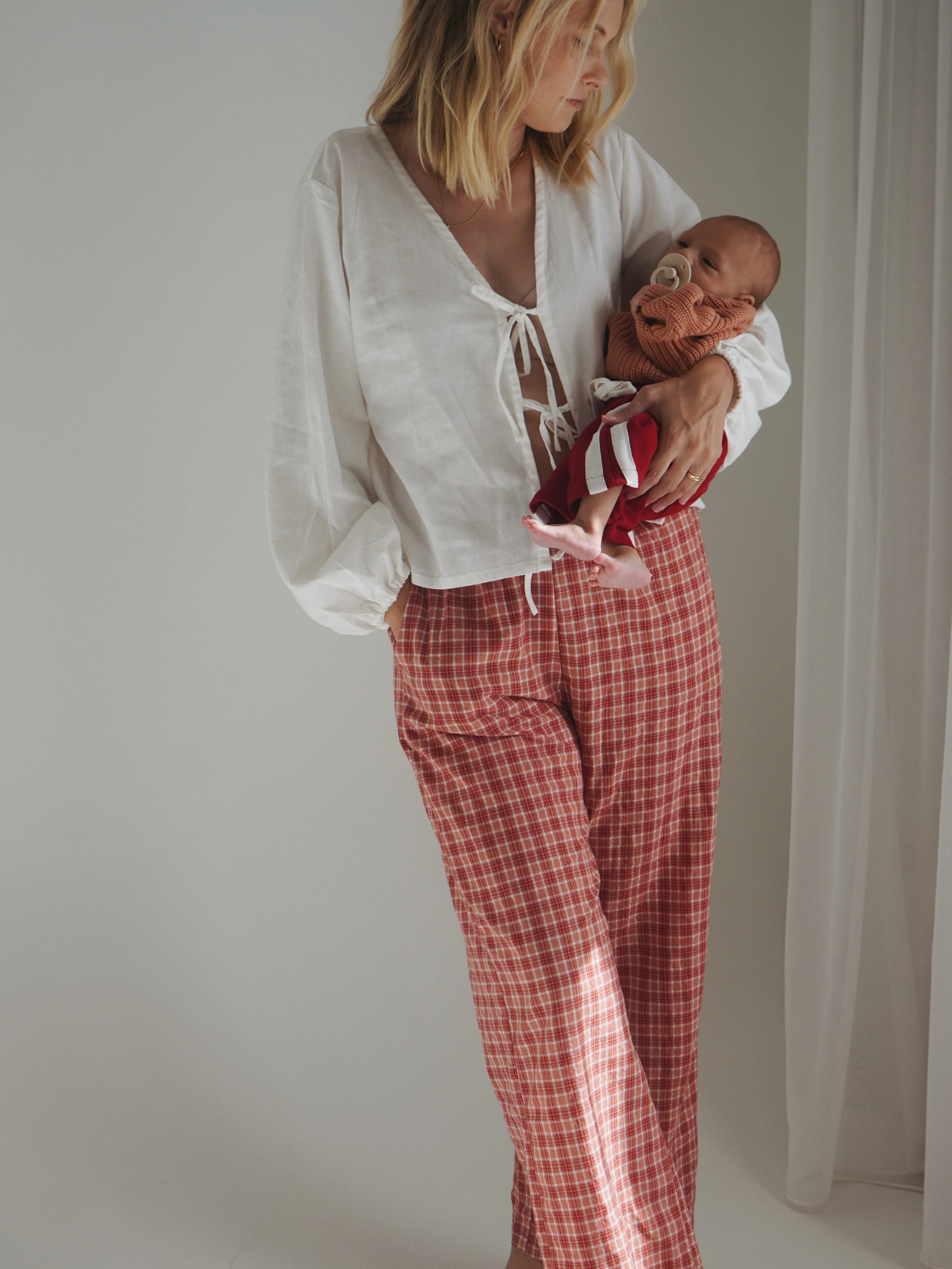 A relaxed and cropped fit, soft linen blend blouse in a white colourway with ties down the middle and a cuffed sleeve. The perfect neutral blouse to pair with any of our Women's items.