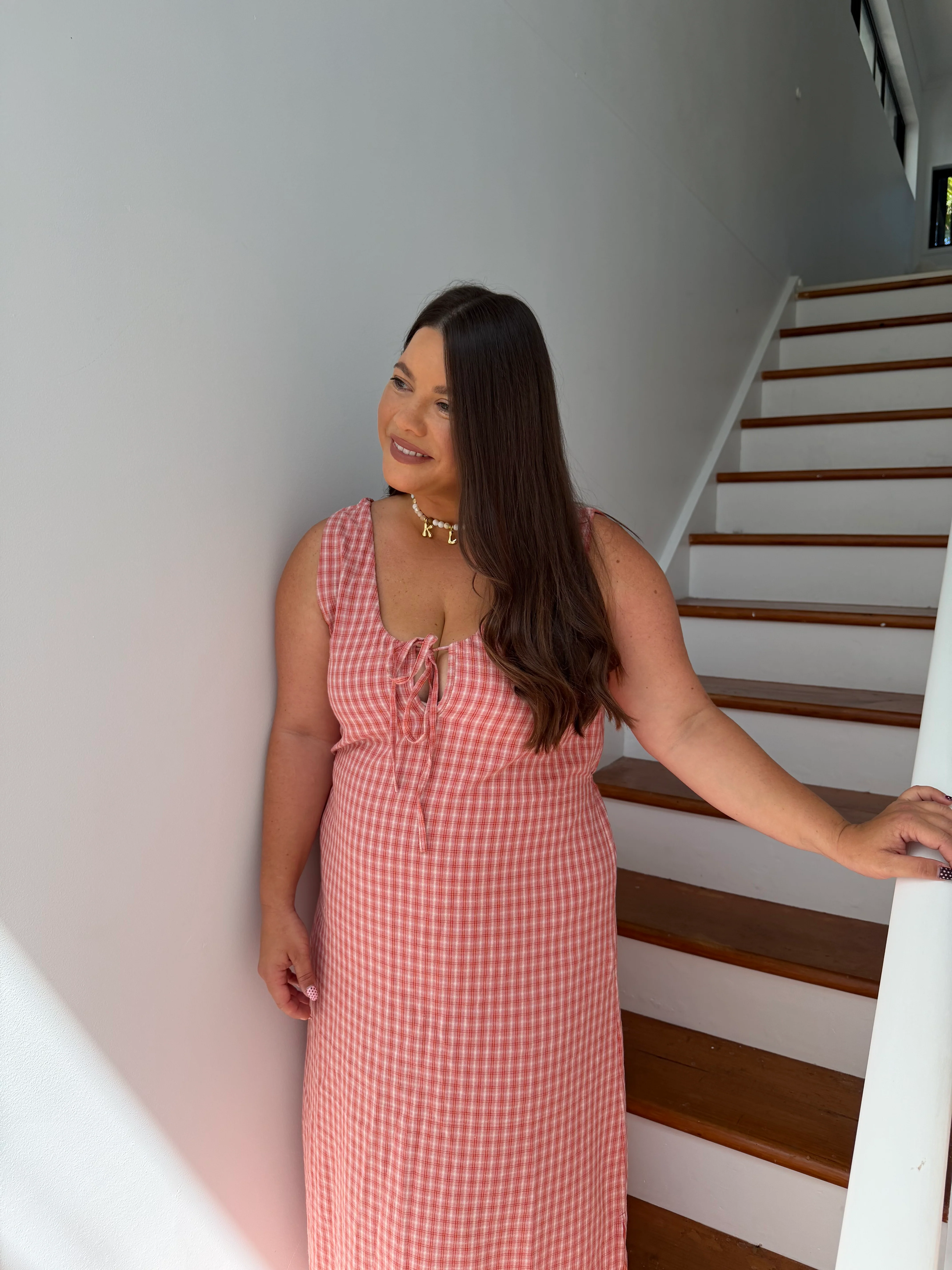 Lightweight cotton dress in our Lumi fabric. Breastfeeding friendly with invisible zips on either side. Adjustable chest tie at front and waist ties at the back allow for a flexible and customisable fit. Option to reverse dress and have tie at back or front.