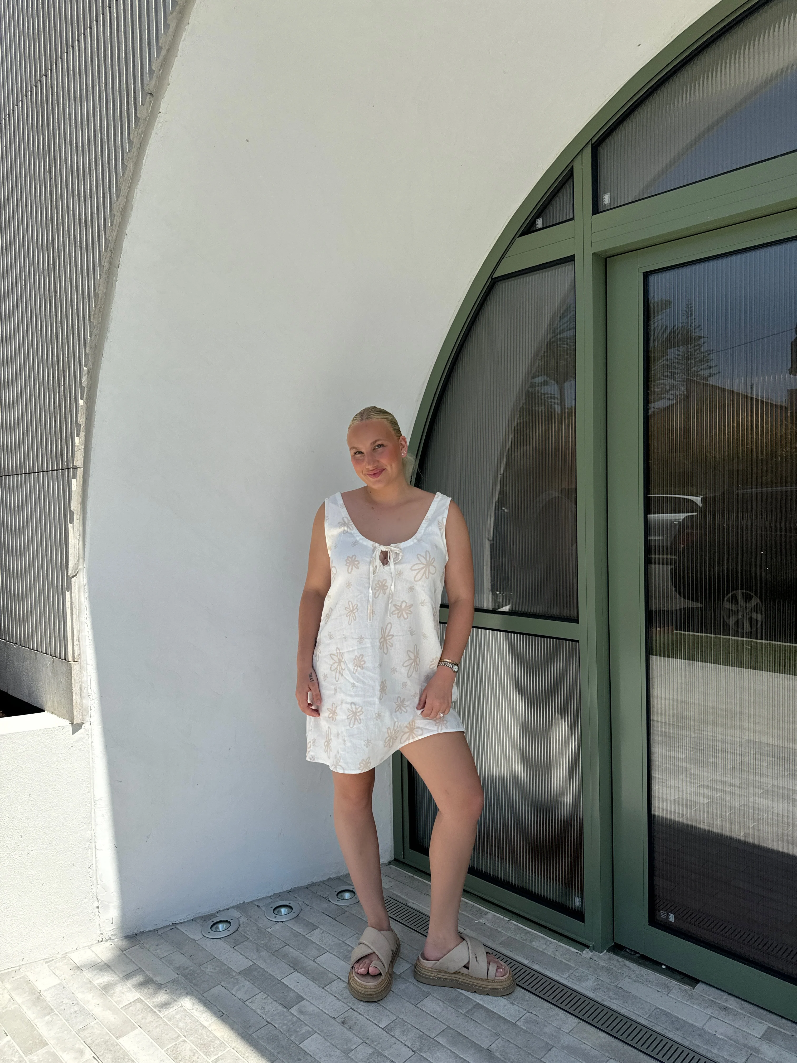 Lightweight linen blend dress featuring our Gia print. Breastfeeding friendly with invisible zips on either side. Option to reverse dress and have tie at back or front.