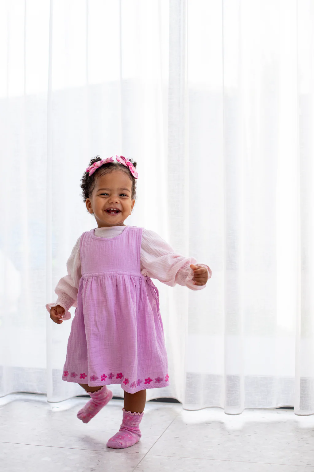 Cotton dress featuring our Cora floral design embroidered around the bottom hem of dress. Adjustable ties at waist and buttons on the back for easy on/off. Mix and match with items from our Cora, Lila + Grace Collections.